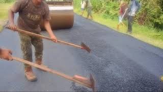 kegiatan pengaspalan ini di mulai dari pekerjaan penghamparan material kelas B dan di padatkan, kemudian di lapisi di atasnya lagi dengan material kelas A ...